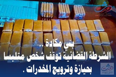 يومه الجمعة 28 يناير الجاري، تمكنت فرقة الابحاث والتدخلات التابعة لفرقة الشرطة القضائية بمنطقة أمن بني مكادة من توقيف شخص متلبسا بحيازة وترويج المخدرات .
