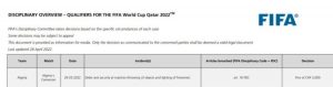 حسب بعض المصادر الاعلامية، اصدرت الفيفا عقوبات تأديبية بخصوص بعض مباريات تصفيات كأس العالم FIFA قطر2022، من بينها مباراة منتخبي الجزائر و الكاميرون.