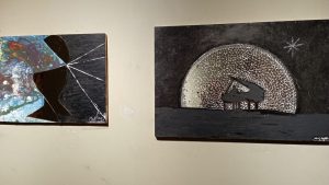 ويظل العمل المميز هو لوحة الجنين المؤلفة من قطع زجاجية متفرقة، حيث يحاكي الفنان رحلة التكوين داخل الرحم عبر تجميع الشظايا واحدة تلو الأخرى، في تقاطع دال بين العلم والخيال، بين البيولوجي والجمالي.