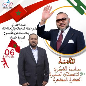 بمناسبة الذكرى الخمسون لانطلاقة المسيرة الخضراء المظفرة، التي صادفت اعتماد مجلس الأمن الدولي قرارا تاريخيا يشكل تحولا نوعيا في مسار تسوية النزاع المفتعل حول الصحراء المغربية، يطيب لي باسمي الخاص ونيابة عن السادة أعضاء المجلس الجماعي للصخيرات، بأن نتقدم إلى الجناب الشريف مولانا صاحب الجلالة الملك محمد السادس نصره الله وأيده بأحر التهاني وأصدق الأماني، سائلين الله العلي القدير أن يبقيه ذخرا وملاذا لشعبه الوفي، ومستحضرين في الوقت ذاته مسيرة الخير والنماء، التي عمت أقاليمنا الجنوبية المسترجعة وبوأتها مكانتها المتقدمة بين باقي مدن مملكتنا الشريفة.